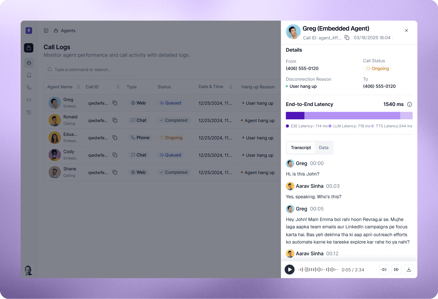 Call & Session History provides teams with full visibility into how AI agents interact with users across calls and in-app sessions. It brings together conversation timelines, transcripts, latency, and outcomes in one place—making agent behavior observable, debuggable, and improvable over time.